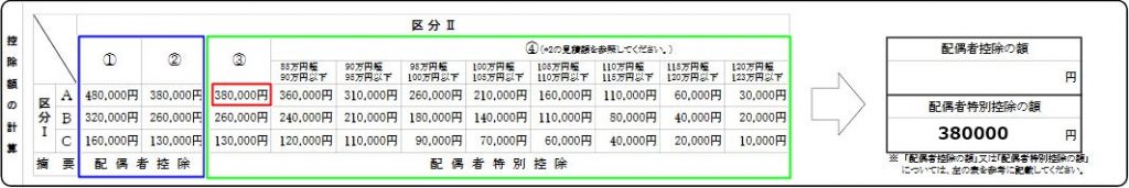 旦那様Aで、奥様Bなので赤枠の範囲となり、配偶者特別控除の額380,000を記載します。